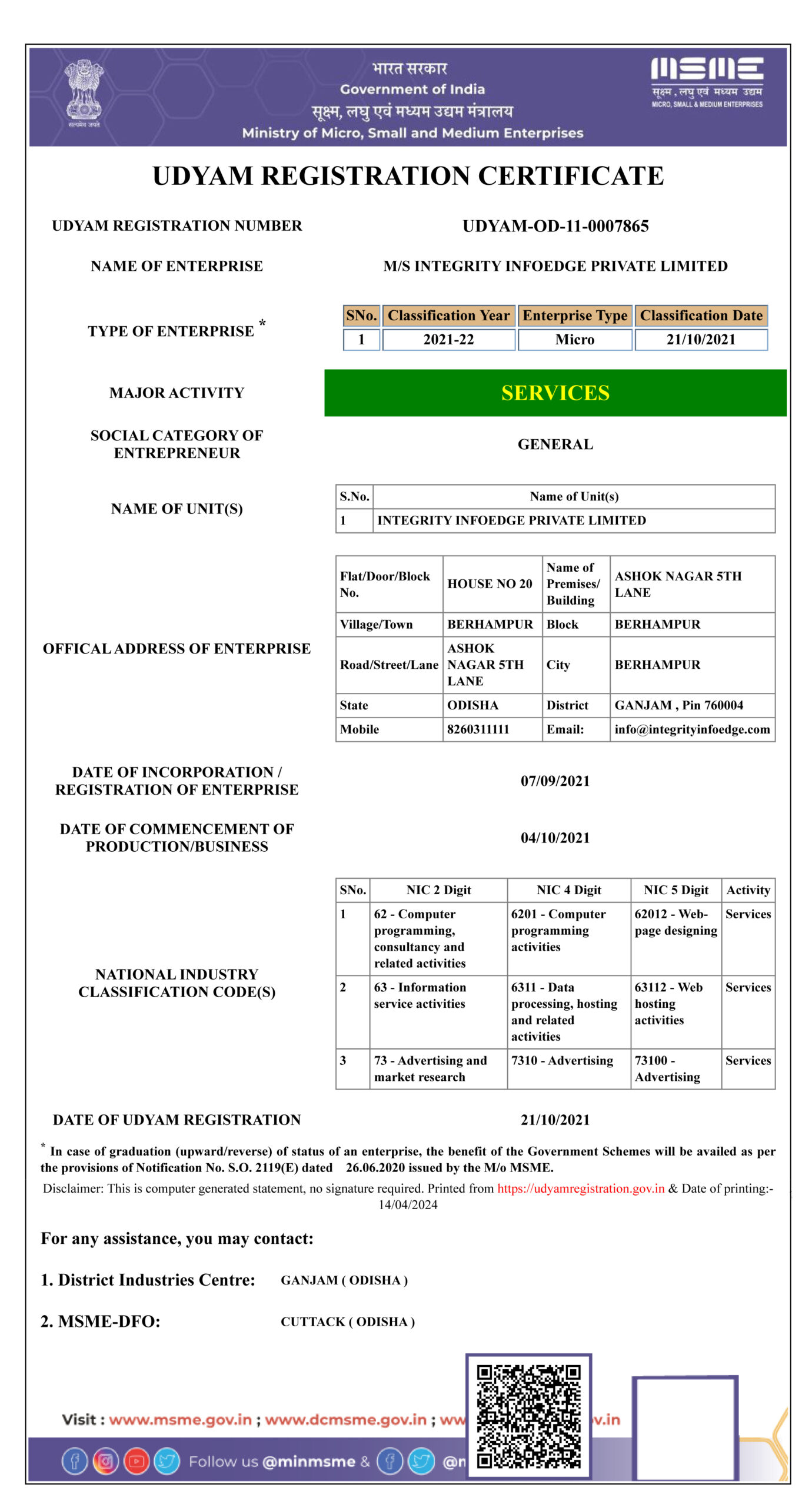 UDYAM REGISTRATION NUMBER: UDYAM-OD-11-0007865 NAME OF ENTERPRISE: M/S INTEGRITY INFOEDGE PRIVATE LIMITED